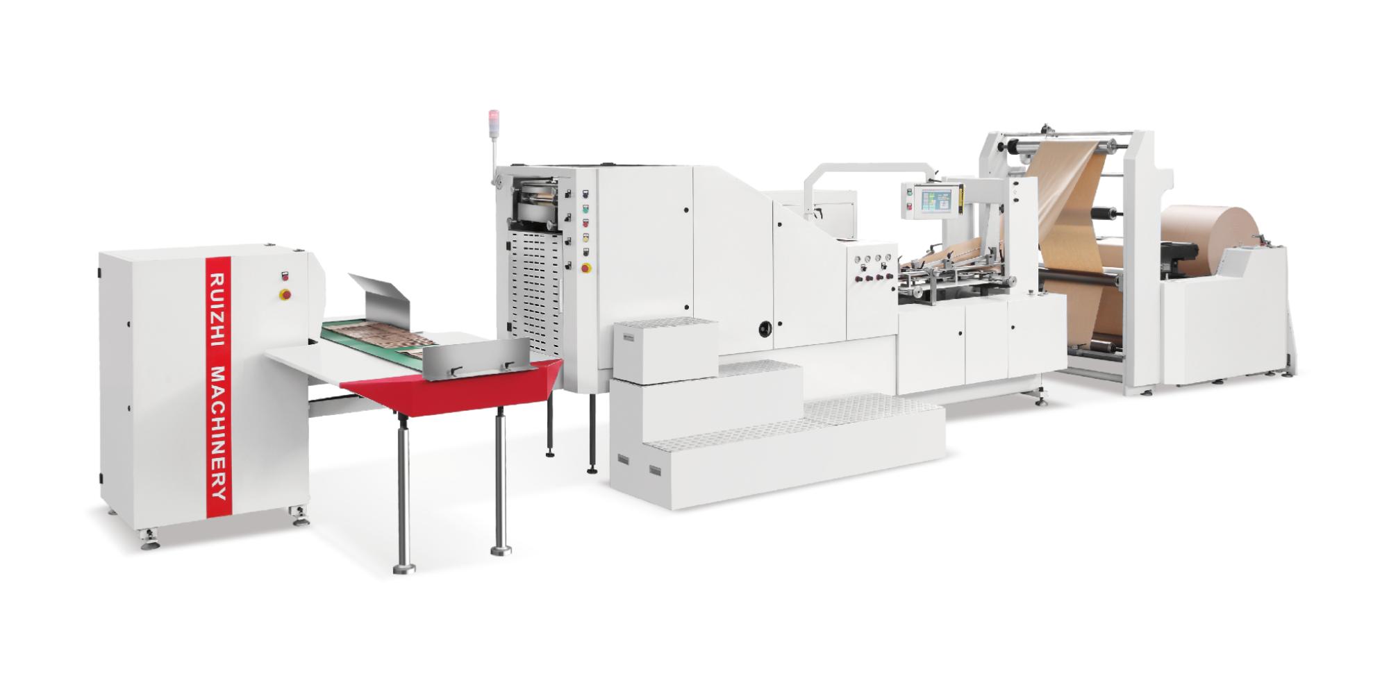 RZFD-550N 方底纸袋机围绕方底纸袋的规模化生产需求进行开发,以卷筒纸为原料,将纸张输送、涂边胶、成筒、裁切、压痕及方底成型等工序进行一体化整合。各工序在统一控制下协同运行,减少人工分段操作对生产节奏的影响,使制袋流程更加连贯稳定,适合包装企业开展大规格方底纸袋的连续化生产。